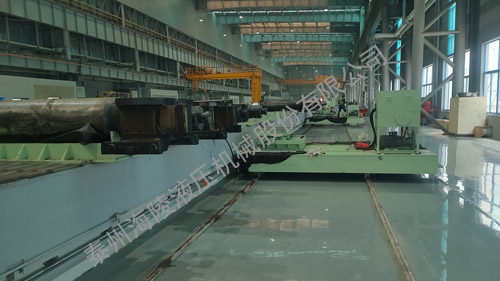 轴承座拆装机的执行机构采用液压驱动,中间转辊装置由液压马达驱动,拆轴承座时,用吊车将所要拆的轧辊(带轴承座)放置在中间托辊组上,将两侧拆装车运行至轴承座下方,通过拆装小车沿X轴方向运动,使轴承座脱离轧辊。